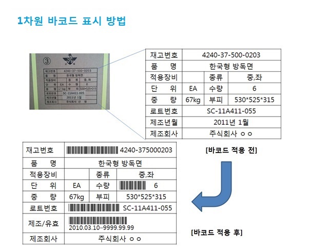 2. Ȱ¿ë ¹üÀ§ : ±¹¹æ Ç¥ÁØ ¹ÙÄÚµå´Â ±º¼öǰÀ» °ü¸®ÇÏ´Â ÇöÀåÀÇ ¼öÀÔ/°Ë¼ö(°Ë»ç)¾÷¹«, ÀúÀå¾÷¹«(ºÐ·ù/ÀÔ°í/ÀúÀå°ü¸®), ºÒÃâ¾÷¹«(»öÃâ/ÀçÆ÷Àå), ºÎ´ë °£ ±º¼öǰ À¯Åë ½Ã »ç¿ëÇÏ´Â Áõºù¼ ÀÎ½Ä ¹× â°í ³» ÀúÀå´ëÀÇ À§Ä¡ ½Äº° µî¿¡ Ȱ¿ëÇÑ´Ù.