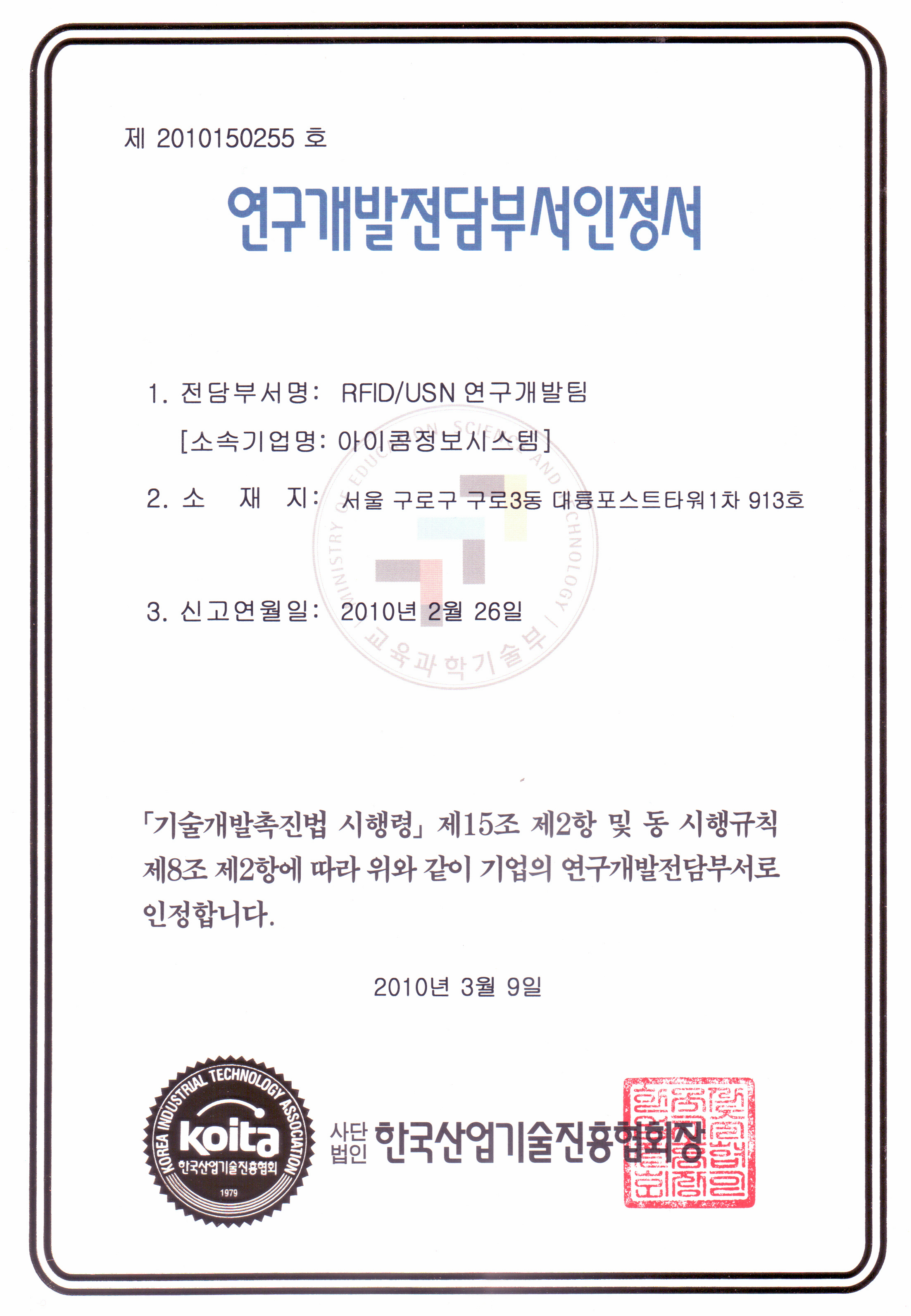 기업부설연구소 / 연구개발전담부서 (RFID/USN 연구개발팀) 인정 : 제 201050255 호